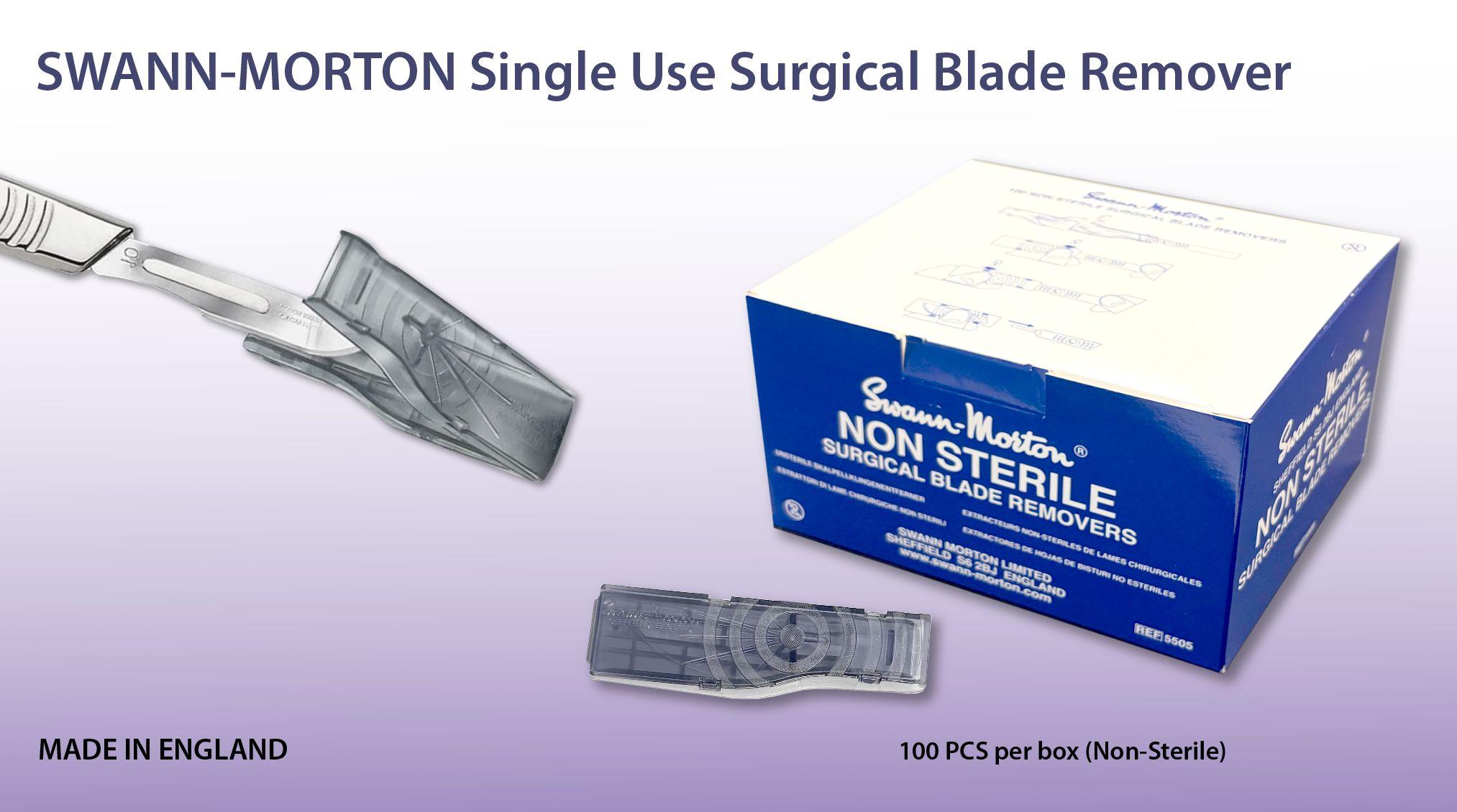 The SWANN-MORTON Single Use Blade Remover is engineered to extract surgical blades safely and efficiently from No.3 and No.4 handles, supporting blade sizes across a wide range. Designed for single-use applications, this tool ensures safe handling and disposal during surgical, veterinary, or aesthetic procedures. Its simple press-and-eject mechanism ensures quick blade removal without the need to touch the blade directly. These non-sterile, single use blade removers are supplied in a box of 100. Made in England.