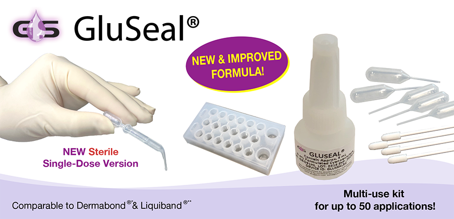 GLUSEAL by Glustitch is a clear liquid adhesive bandage designed to protect minor cuts, scrapes, burns, and skin irritations from infection. It offers an effective, atraumatic alternative to sutures for closing small incisions and lacerations, providing excellent cosmetic results. The updated formula cures to a smoother, more flexible finish for enhanced comfort and performance.